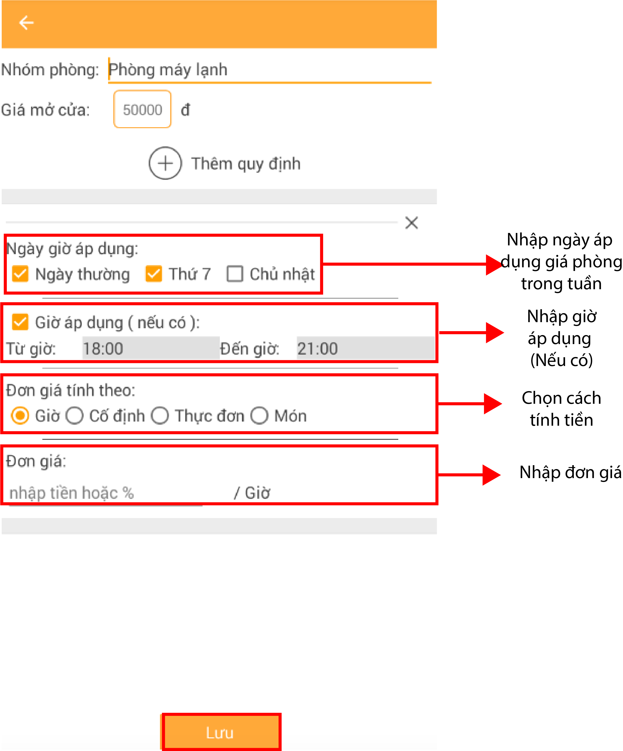 Để xem chi tiết hoặc điều chỉnh giá phòng, nhấp vào chữ [Giá phòng]